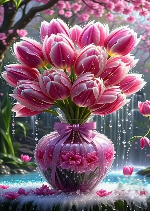 Diamantové malování - Růžové tulipány + třpytivé kamínky (50x70)